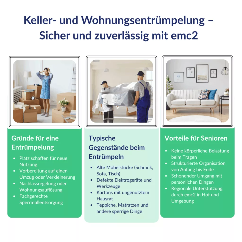 Die Frage nach der Entrümpelung von Keller, Dachboden oder Wohnung beschäftigt viele Menschen. Wichtiger als Zahlen ist jedoch die professionelle Umsetzung. Mit emc2 in Hof and surroundings gelingt die Entrümpelung zuverlässig, umsichtig und nachhaltig.