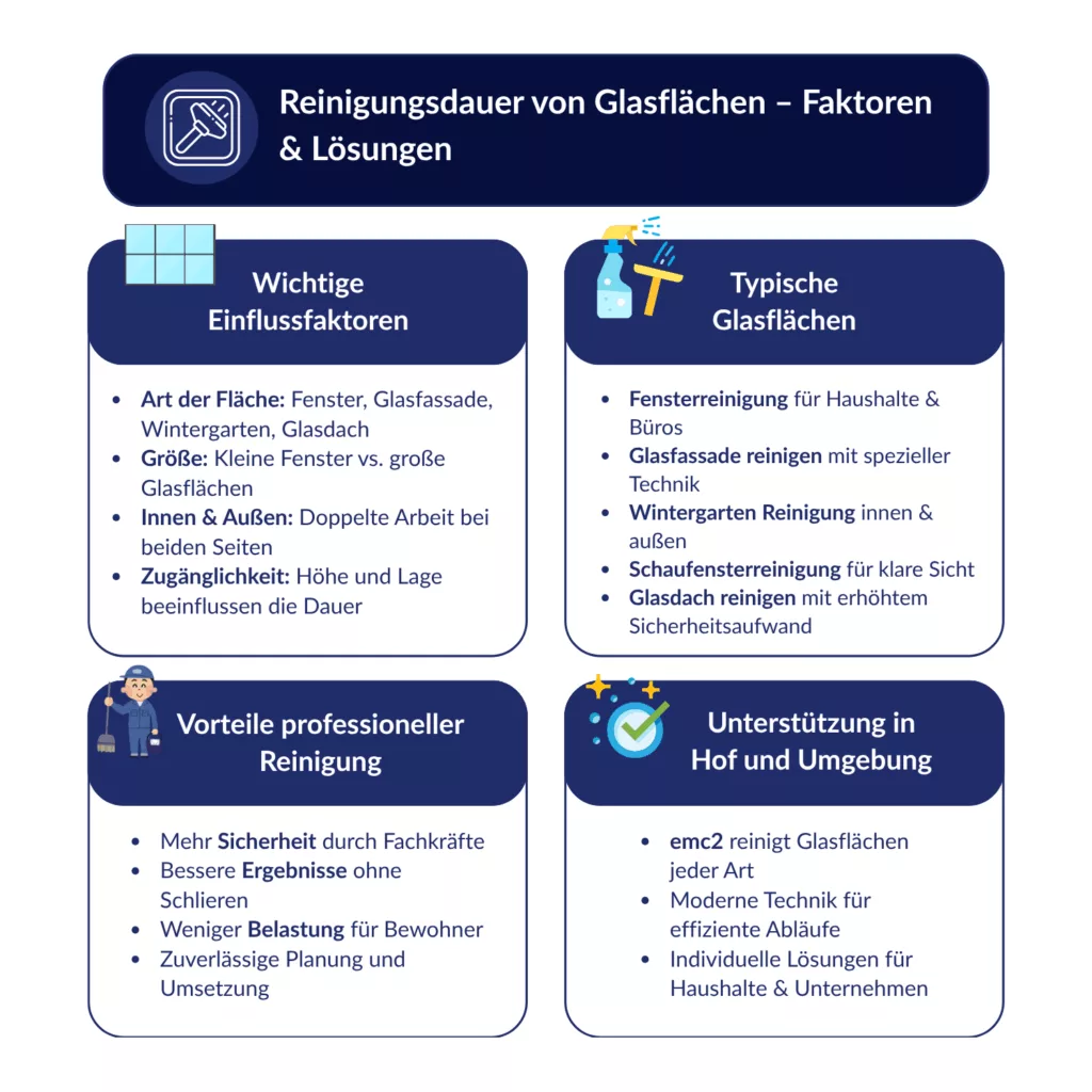 Die Reinigungsdauer von Glasflächen hängt dabei von vielen Faktoren ab: Größe, Zugänglichkeit, Verschmutzungsgrad und verwendete Technik. Besonders in Hof and surroundings vertrauen Kunden auf emc2, wenn es darum geht, Glasflächen professionell und effizient reinigen zu lassen.