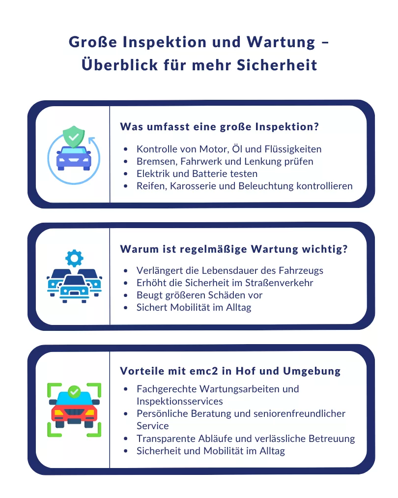 Besonders die große Inspektion ist von zentraler Bedeutung, da sie den gesamten technischen Zustand prüft und mögliche Schwachstellen frühzeitig erkennt.