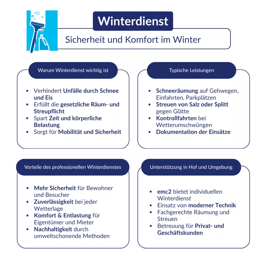 Wer in der Region einen zuverlässigen Winterdienst sucht, findet in emc2 einen erfahrenen Partner. Mit individuell abgestimmten Konzepten sorgt das Team dafür, dass private und geschäftliche Flächen während der gesamten Wintersaison sicher begeh- und befahrbar bleiben.