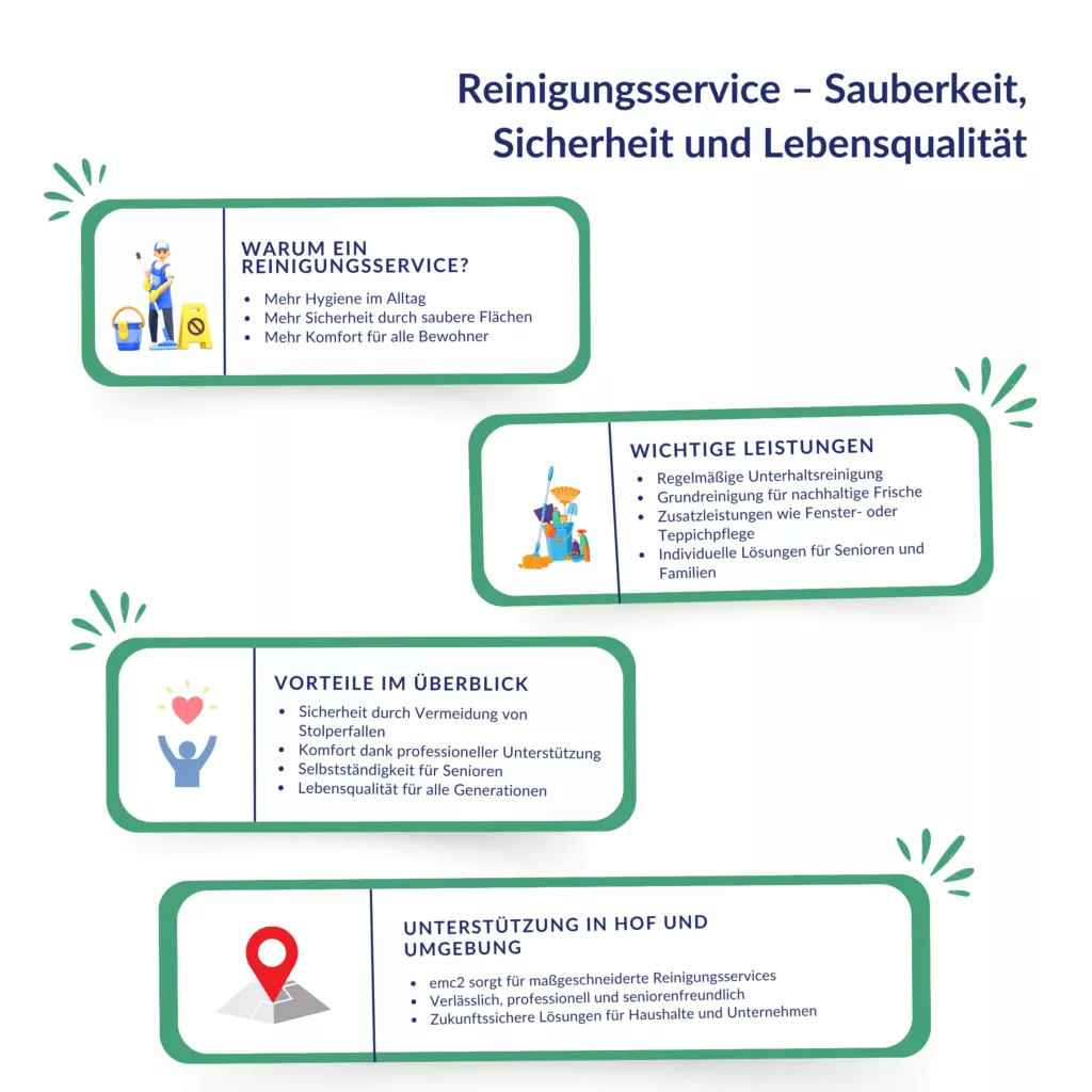 In Hof and surroundings unterstützt emc2 Familien, Senioren und Unternehmen dabei, ihren Alltag zu erleichtern und ihre Umgebung langfristig sauber und sicher zu gestalten.