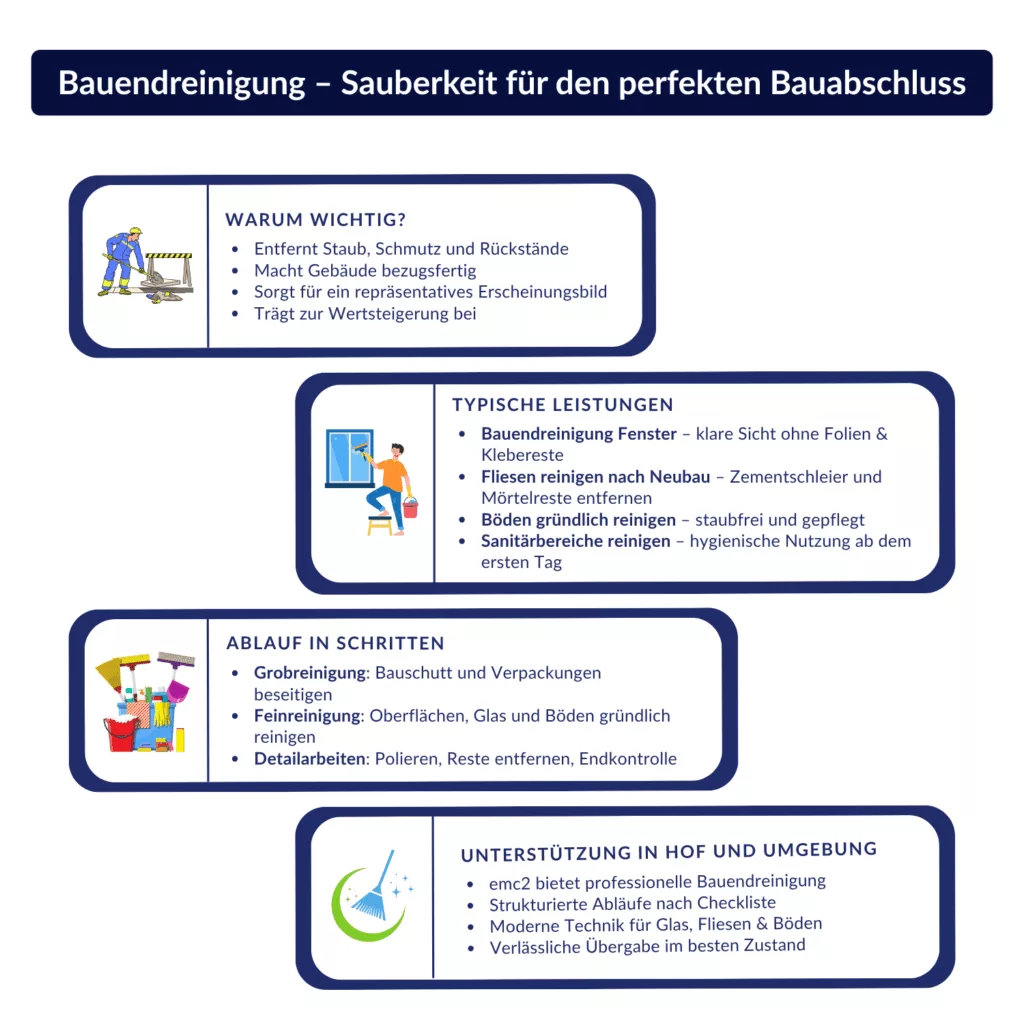 Mit einem klaren Bauendreinigung Leistungsverzeichnis lässt sich der Ablauf transparent darstellen. Unternehmen wie emc2 in Hof and surroundings bieten strukturierte Planungen und maßgeschneiderte Lösungen für Bauherren und Immobilienbesitzer.