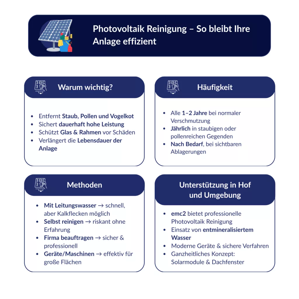 In Hof and surroundings bietet emc2 umfassende Services zur Photovoltaik Reinigung, die sowohl für private Haushalte als auch für Unternehmen geeignet sind.