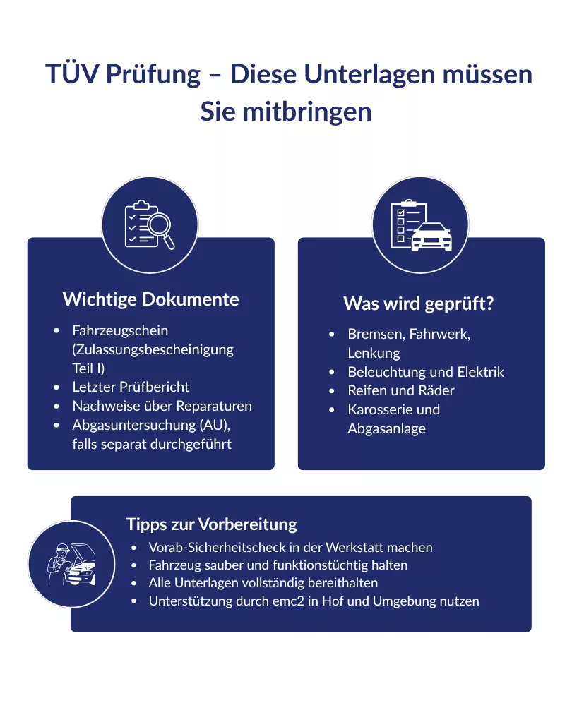 Mit emc2 haben Fahrzeughalter in Hof und Umgebung einen Partner, der die Vorbereitung auf die TÜV Prüfung erleichtert:
