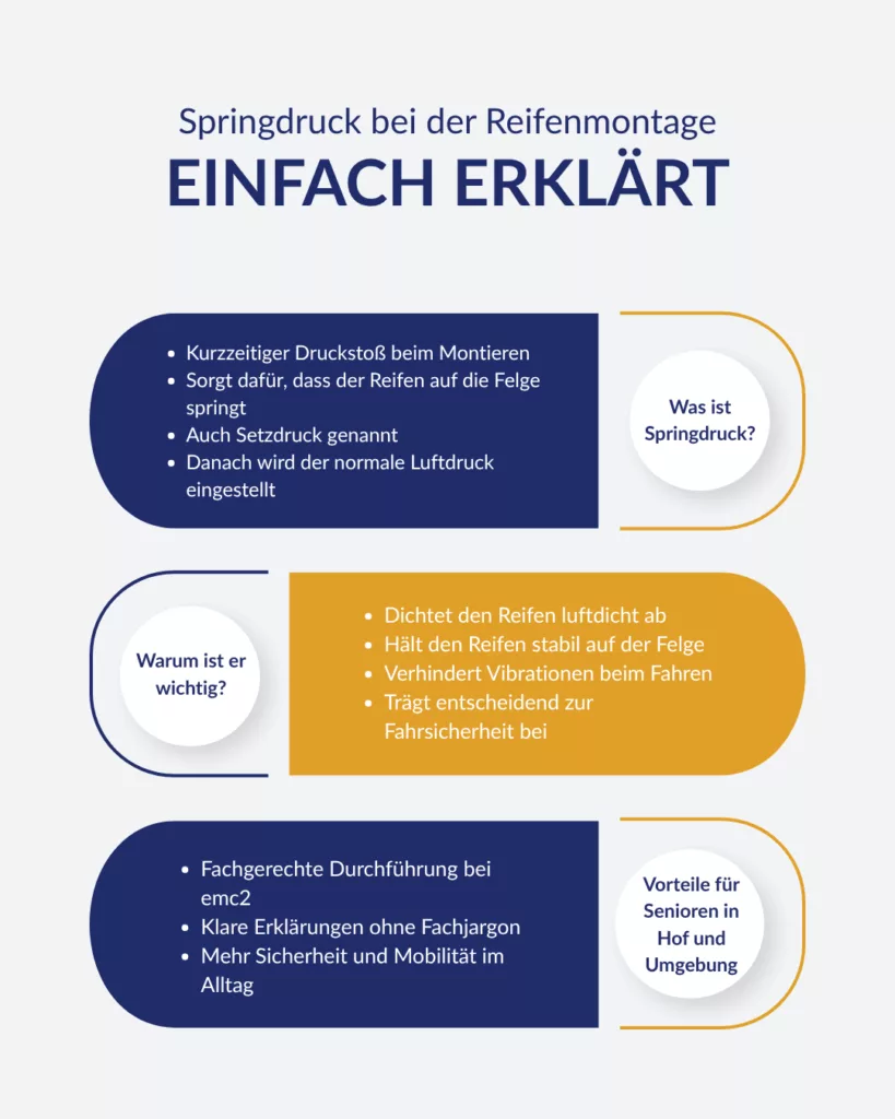 Wer schon einmal bei der Reifenmontage zugeschaut hat, hört dabei oft den Begriff Springdruck oder auch Setzdruck Reifen. Doch was genau versteht man darunter? Für viele Autofahrer – besonders Senioren in Hof und Umgebung – ist es wichtig, Fachbegriffe einfach erklärt zu bekommen.